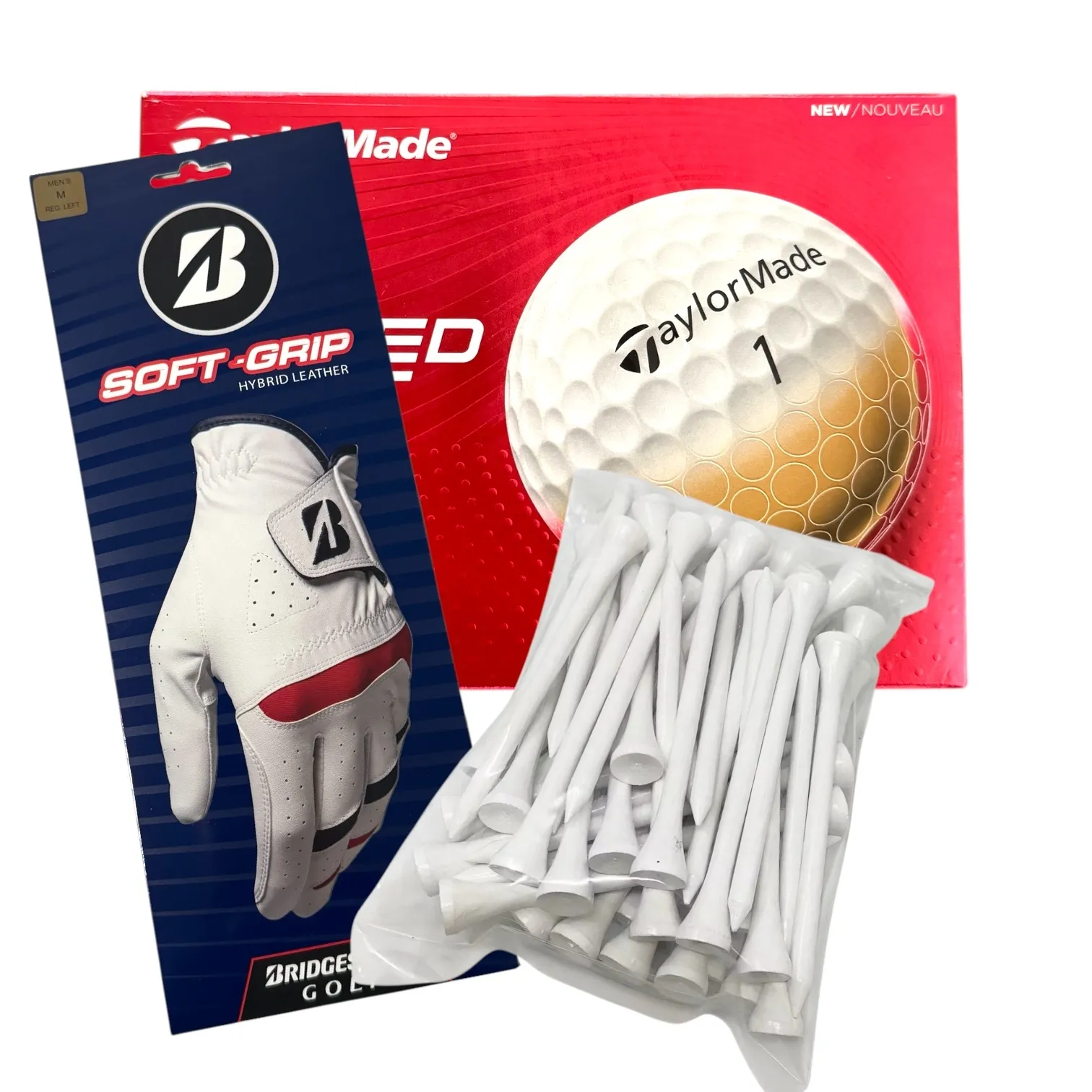 Includes a dozen Taylormade Speedsoft golf balls, Bridgestone Soft Grip glove and 20x white tees